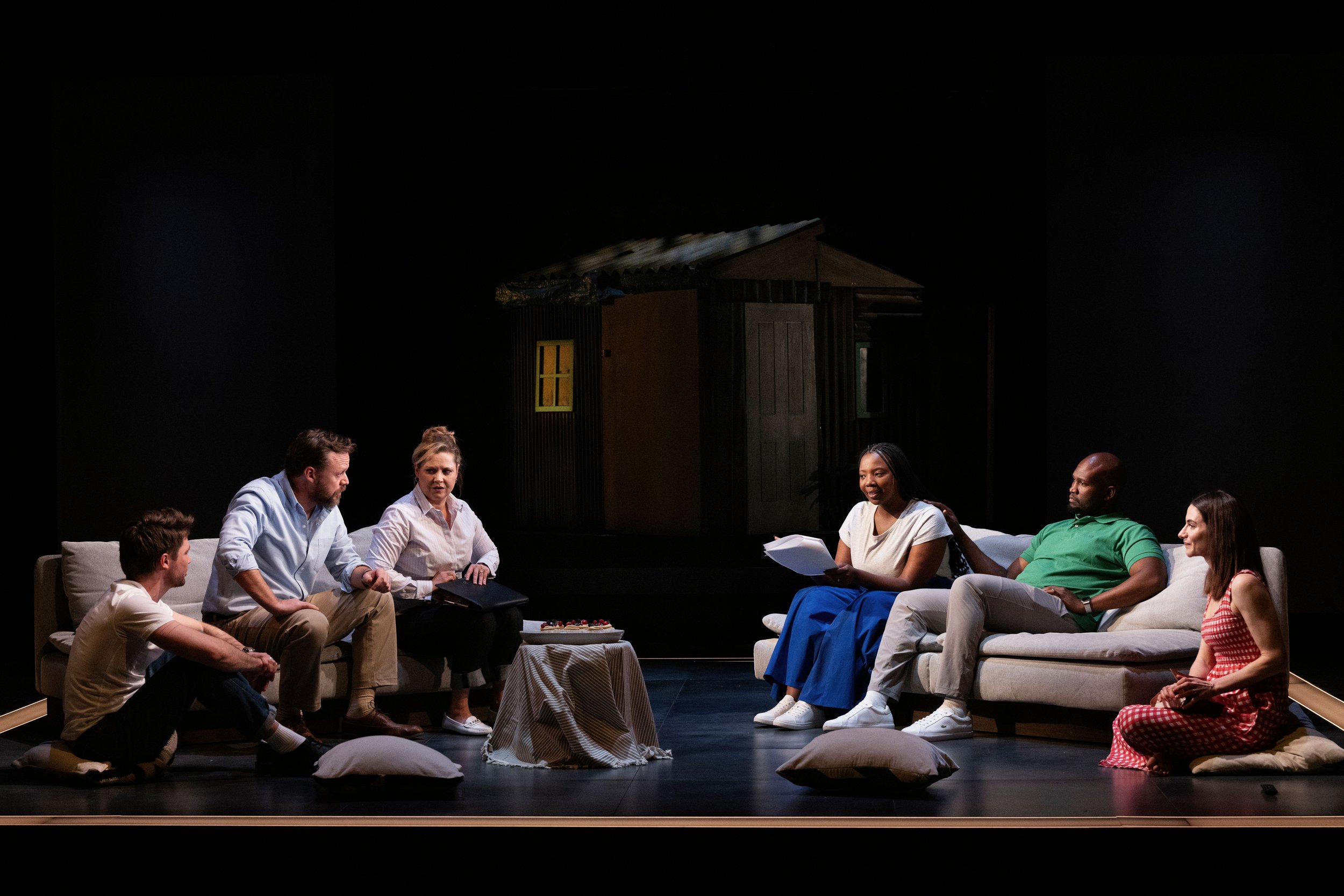 Very fuuny and pulling no punches Amy Jephta's comedy about not in my back yard behaviour is set in Stillwater is a new housing development somewhere in South Africa although it could be anywhere. Resident Chris has decided to ask the black man in the street, who seems to be involved in what is happening across the road where new people have moved in, to remove the parked truck which he cannot get past. He is not hostile, just treating the man as a workman, except that the man is actually Sihile, the new owner of the house and, as we soon discover, he and his wife Bonolo are infinitely more travelled and better off than their new neighbours. They are accepted as harmless but not invited in to the community which is predominantly white – but eventually Chris and Lynette, his wife, an estate agent who has been selling property on the estate, turn up for drinks, and then another couple, Andrew and Jess. younger and coping with the fact that they are struggling to afford their house, join in the social gatherings. The problem is that on a vacant site a shack has appeared built by nobody knows who and what follows is the attempt by the white residents to get the coloured couple to sign the necessary papers to set in motion the attempt to have it removed in the course of which just what being good neighbours is exposed. Sihile and Bonolo are inclined to sign – they too have bettered themselves, have left their origins behind, and aware of how that escape can be endangered - until suddenly Chris reveals that the neighbours have been discussing the shack on the estate whatsap – that it exists is news to Sihile. There are limits to neighbourliness. The confrontations between the three sets of couples are carefully constructed and the destruction of the surface friendliness, the we are all neighbours together myth, hits home with great effect. This could be anybody's street where the residents aspire to be upwardly mobile, where the price of one's home matters and what is in one's back yard matters most of all. The performances by the entire cast are nicely judged with Sifiso Mazibuko impressive as Sihile and Kai Luke Brummer revealing the racism beneath the apparently pleasant Andrew, who runs a sandwich shop and has gone too far upwardly mobile, to shocking effect. The shack which destroys the apparently idyllic world of Stillwater designer ULZ has created rises at the rear of the set on cue. The play makes one reflect on what those for sale boards may mean for the contentment of one's own street crammed with “good neighbours” and did bring Bruce Norris' Clybourne Park to mind as it dealt with similar themes.