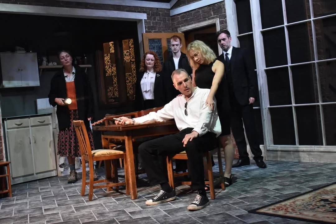 All the elements come into play here; stormy New Year’s Eve night, car crash, remote old converted barn, bad weather, lights flickering on and off, no phone signal……. the list goes on. As the curtain rises, has-been singer, Danny Sierra arrives with girlfriend and members of his family heading home following the funeral of his mother. Arguments erupt and old grudges come to the surface as they all deal with the night ahead.