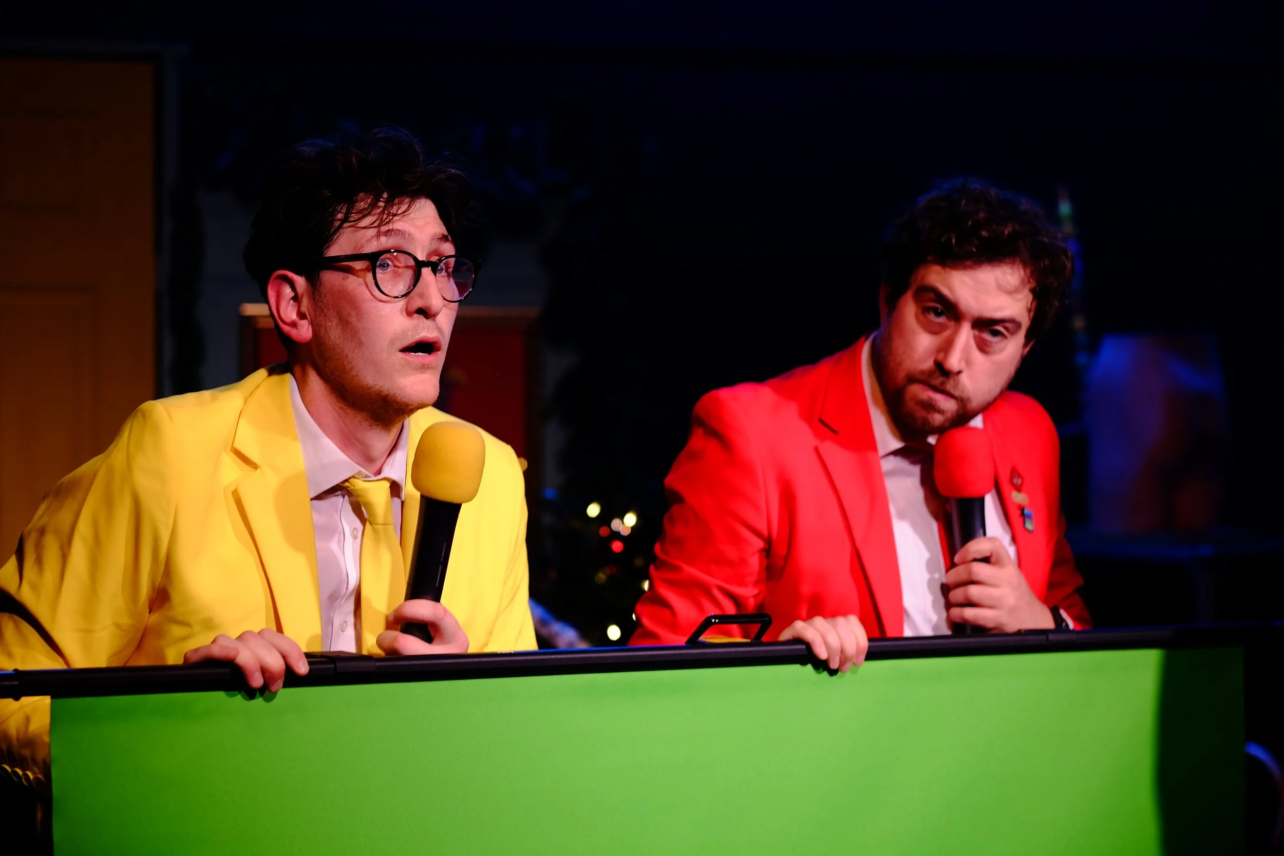 Prepare for the unexpected in this gloriously silly night in a broadcasting studio presided over by a man in yellow suit, Tim Clarkson, who comperes things, and one in a red suit seated at the controls in a red suit, Owen Visser, assisted by people we do not get to see. Clarkson is a manic presence, pulling people out of the audience to help – one hapless reviewer got a helmet with a remote control camera placed on his head and made to transmit interviews with equally hapless guests plucked rom the audience on to a screen for all to see. \meanwhile Visser, who is minimally more restrained, worked at the control desk, activated robots and remote cameras and sometimes gets thing wrong. What it is all about is anybody's guess but it is undeniable hugely entertaining, nobody gets humiliated, even the real delivery men summoned to bring food to the theatre who arrive at the stage door to be dragged on to the stage – at least I think one was real, but as to the second one I am not so sure – are well treated. There are no smutty jokes, a few double entendres and a bust of a bottom with a red carnation stuffed in the obvious place among the items adorning the set which oddly never gets used or referred to. But best not to sit in the front row as more than one person there ended up on stage. It is an evening of mayhem and madness, not quite a play but more of an event.