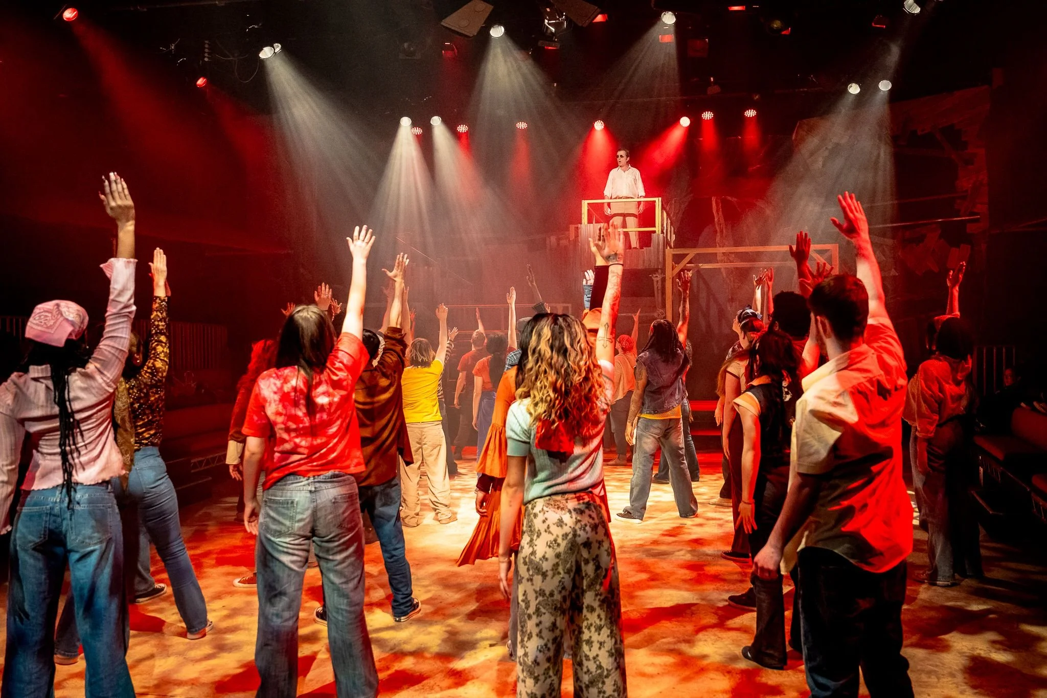 The production features the strongest collection of acting performances that I have seen at Chickenshed. I must highlight the most incredible performance of the show. Jonny Morton is revelatory as Jim Jones. His menace and malevolence fills the auditorium with a powerful aura. In a show filled with excellent performances, Morton’s twisted magnetism steals each and every scene. He and Tristan Manzi, playing younger Jim Jones, perfectly and sickeningly capture the cult leader’s pure and unadulterated evil.