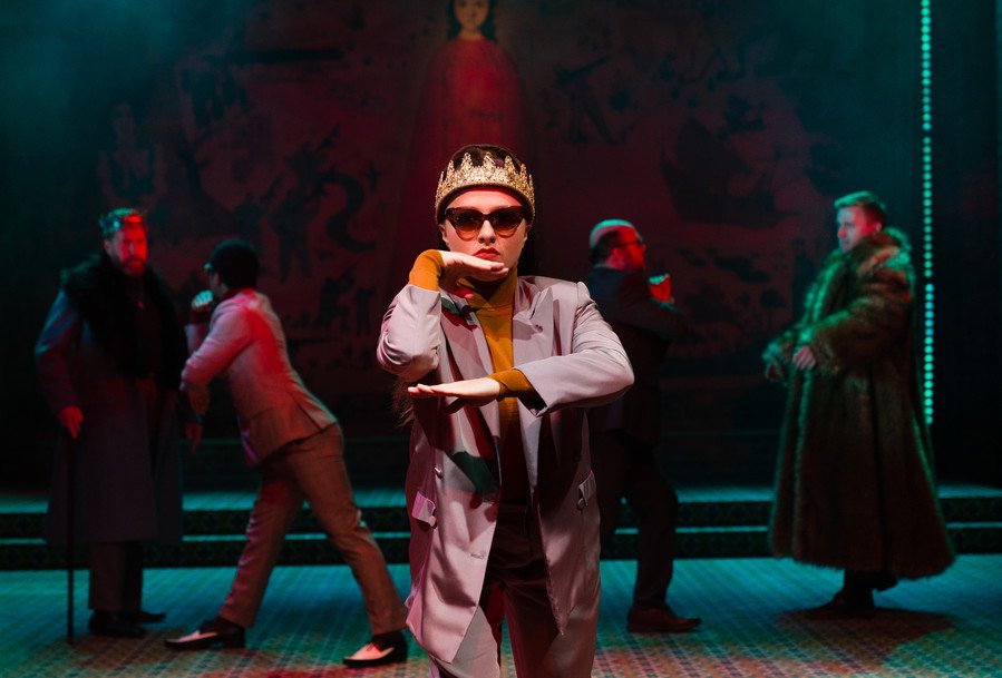 Shakespeare, writing in around 1594, may well have been examining the precarious nature of England’s succession and global position under Elizabeth I; this neatly translates to England in the 1960s; and is strengthened with the portrayal of an Irish Dauphin. But the background is complex, and Shakespeare is developing his craft. There are too many characters introduced too quickly for us easily to follow the story. Rhode’s chosen showy style does nothing to help with clarity and storytelling. Moreover, the cross gender casting of King John adds nothing, except increase the confusion.