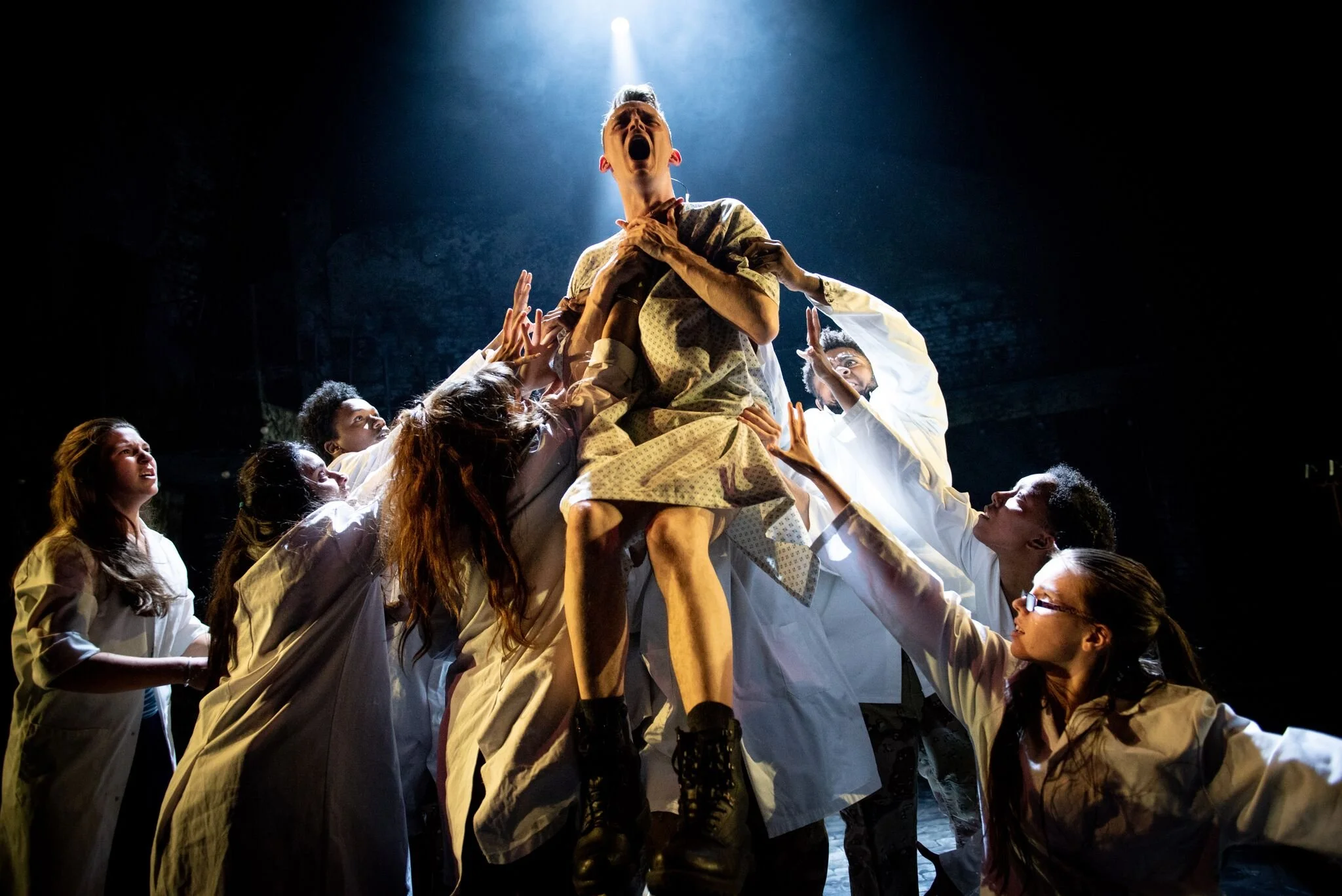 Woyzek is a notable production for a number of reasons. It is a community production with a cast of more than 100 performers. It’s a most unusual choice for a community play and Roxana Silbert, who directs, is uncompromising with the play’s themes. The production, therefore, becomes an exciting performance for the audience and a thrilling and learning experience for the community company. In addition, we may note that Silbert is the Rep Artistic Director, clearly a hands-on AD, not one for farming out a tick-box community play.